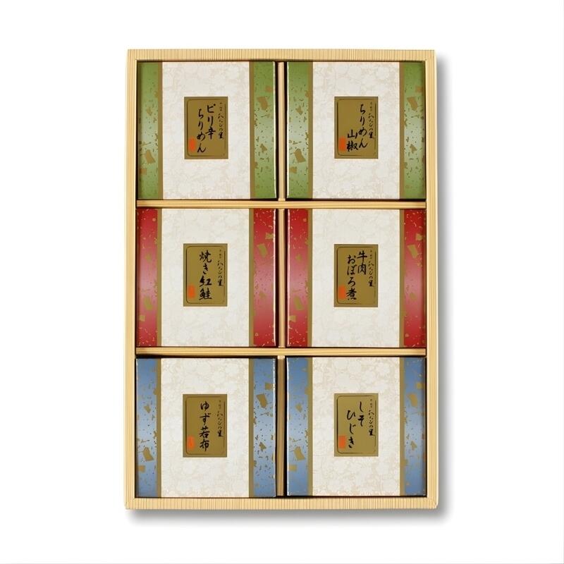 ちりめん山椒、牛肉おぼろ煮、焼き紅鮭など料亭の技が光る六種の詰め合わせです。