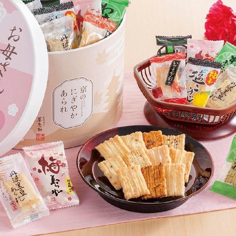 感謝の気持ちが伝わる可愛いパッケージに、色んな味のあられをいっぱい詰め込みました。ご家族やご友人で楽しめる、にぎやかなギフトです。母の日のメッセージをつけてお届けいたします。