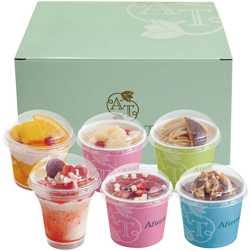 現品・内容・サイズ・材質: 苺のパフェ80ml、スイートフルーツティーパフェ82ml、渋皮栗のモンブラン94ml×各1、洋梨とアールグレイ、苺とチーズ、ダブルチョコレート各103ml×各1(計6)