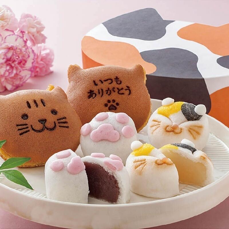 現品・内容・サイズ・材質: 猫どら焼き(小豆あん、しろあん×各1)、三毛猫饅頭、肉球饅頭×各2(計6)