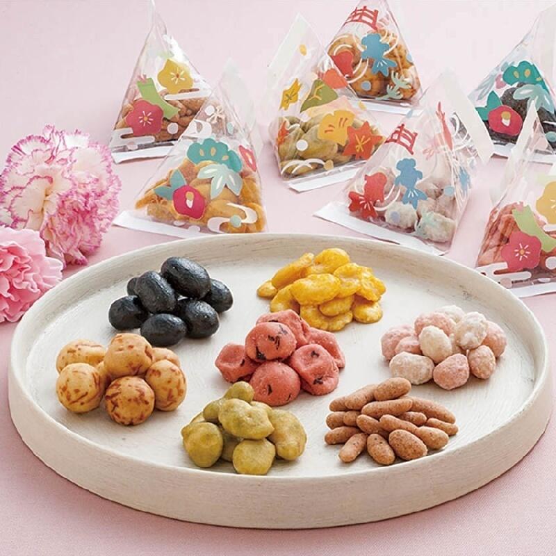 甘味系から塩味系まで、多彩なラインナップをお楽しみいただける、華やかで彩り豊かな豆菓子セットです。「豆(まめ)に過ごせますよう」の気持ちが伝わる心温まるギフトです。