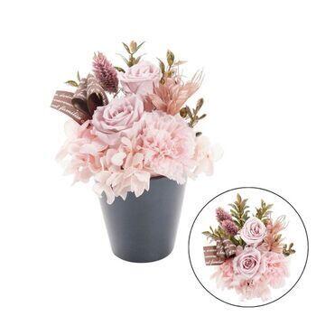 現品・内容・サイズ・材質: ●サイズ(約):H15×φ11cm (クリアケースサイズ:H16×□12cm) プリザーブドフラワー、ポリエステル、ポリエチレン、陶器、フェノール樹脂