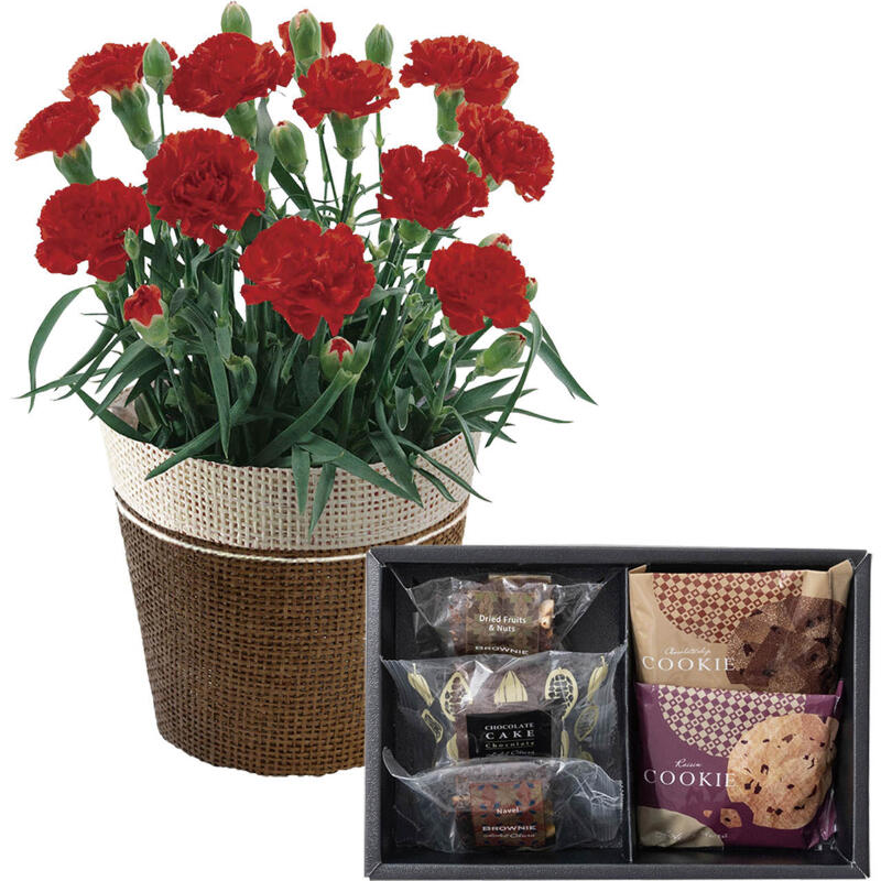 現品・内容・サイズ・材質: カーネーション(レッド)4号1鉢、サイズ:高さ:約20cm、バスケットもしくはラッピングバッグ、ホテルオークラ ケーキ&ブラウニー&クッキーアソート(レーズンクッキー、チョコチップクッキー、ブラウニーネーブル、ブラウニードライフルーツ&ナッツ、チョコレートケーキ×各1個)