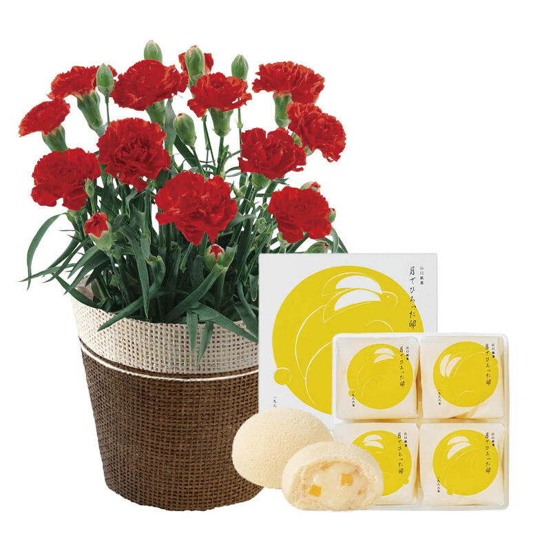 現品・内容・サイズ・材質: カーネーション(レッド)4号1鉢、サイズ:高さ:約20cm、バスケットもしくはラッピングバッグ、月でひろった卵(4個入)