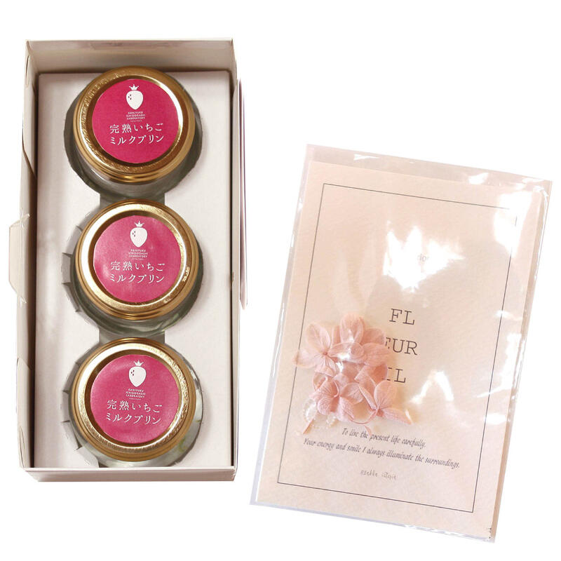 プリンとソース、ダブルのいちごで美味しさにこだわった「完熟いちごミルクプリン」と感謝の気持ちのグリーティングカードのセットです。