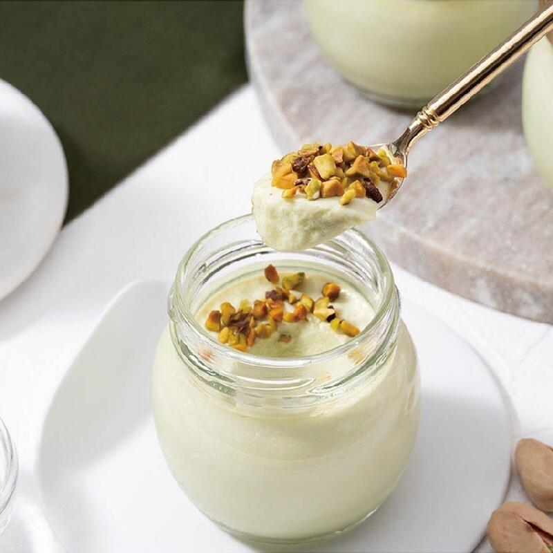 殻を剥いたピスタチオが持つ、奥深いグリーンと上品なピンクの色ムラから醸しでる風味を活かしたなめらかなプリンにダイスクラッシュしたピスタチオをあわせて食感も楽しめるよう工夫しました。