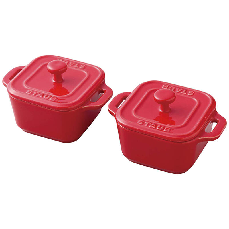 現品・内容・サイズ・材質: 11×8×6.5cm容量約100mlスクエアココット2個、セラミック(耐熱陶器)