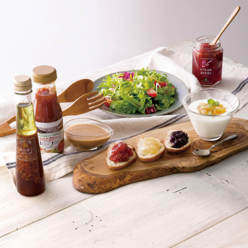 旬の果実を使った3種のジャムと、イタリアンハーブや焙煎ごまなど風味豊かな4種のドレッシングが入っており、毎日の食卓を彩ります。