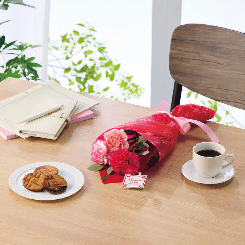 カーネーション花束とキャラメルサンドクッキーのセット。キャラメルサンドはオシャレなクッキー生地で口どけのよいチョコレートと少し苦味をきかせたキャラメルをサンドしました。奥深いおいしさが口の中に広がります。