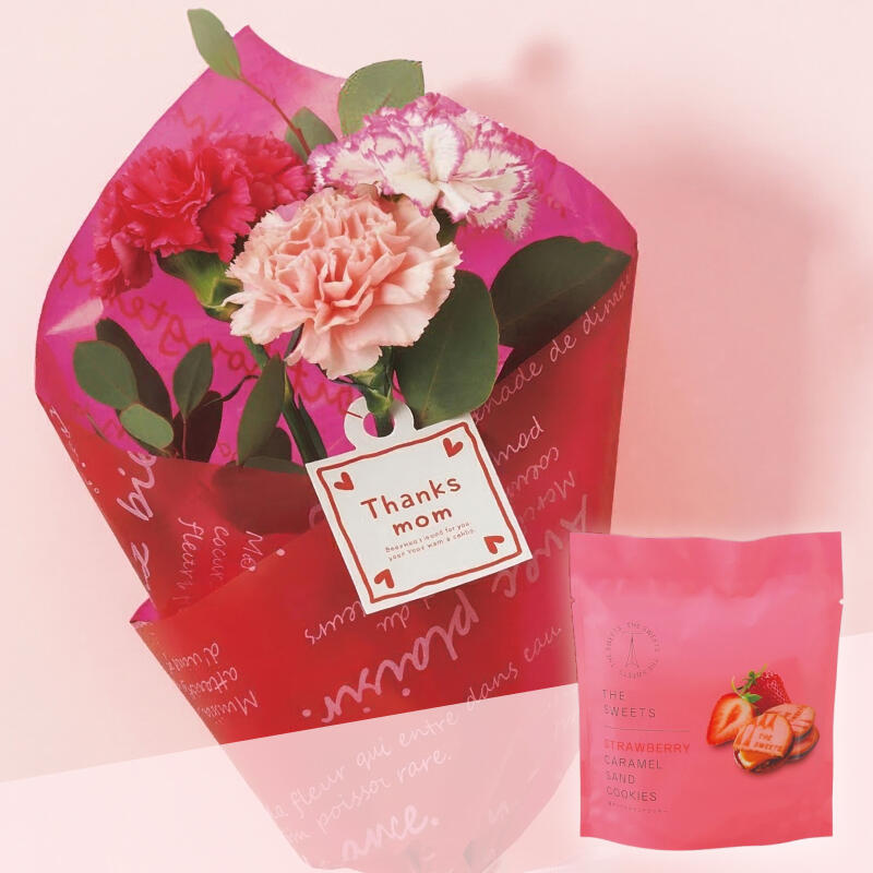 カーネーション花束とキャラメルサンドクッキーのセット。苺キャラメルサンドはあまおう苺のフリーズドライを混ぜた濃厚なラングドシャ生地でキャラメルとチョコレートをサンドしました。