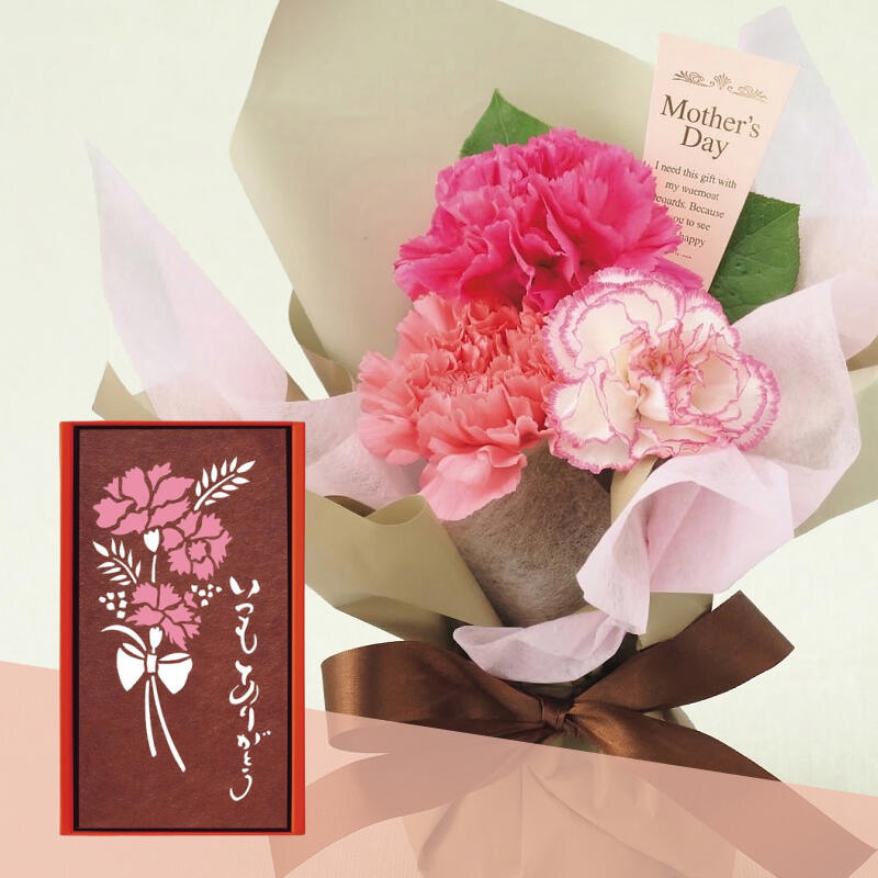 お母さんへの感謝の気持ちを刷り込んだ長﨑堂の母の日カステーラと、届いたらそのままで飾れる花瓶要らずのスタンディングブーケのセット。