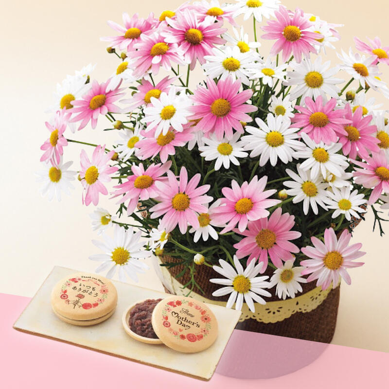 マーガレット鉢植え「さくらべーる」と最中のセットです。花色が変化する愛らしく清楚なマーガレットです。花が次々と咲き、こんもりとした姿をお楽しみいただけます。最中は、母の日オリジナルの可愛いデザインを施した香ばしい皮に北海道産の小豆を使用した餡を挟んでお召し上がりください。