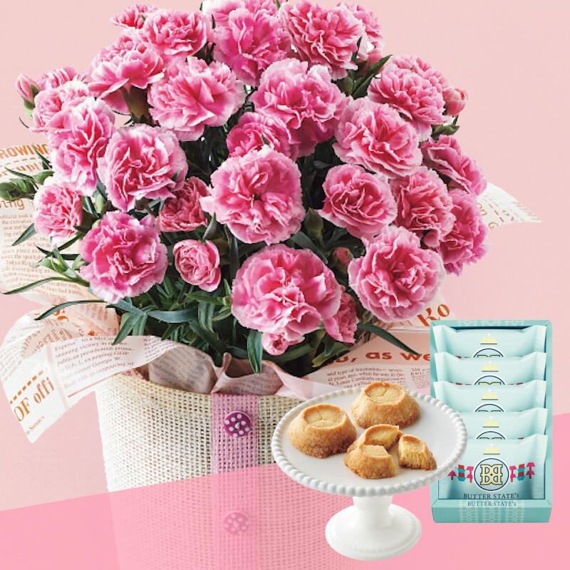 カーネーション鉢植え「ティーパーティ」とバターステイツクッキーTHEバターリッチのセットです。ピンクのグラデーションが美しくレースのようなふんわりとした花姿が魅力的なカーネーションです。情熱こめて厳選配合したトリプルブレンドバターをたっぷり練りこみ、窯の熱でバターが溢れとろける「なだれとろけ製法」で香ばしく焼き上げました。