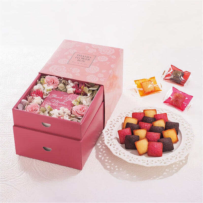 上段は華やかなプリザーブドフラワーボックス。下段はフレンチの人気店「レ ロジェ エギュスキロール」のひと口サイズのカラフルな焼き菓子をセットしました。母の日に、スイーツとプリザーブドフラワーが一緒に贈られる嬉しいギフトです。母の日のメッセージラベルをつけてお届けいたします。