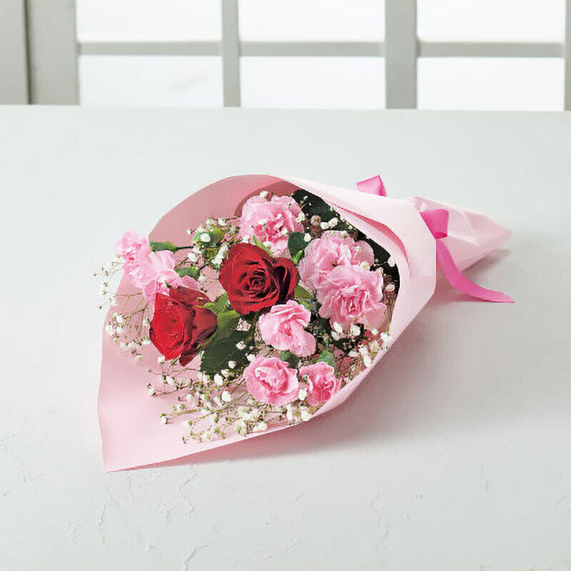 バラ2、カーネーション1、スプレーカーネーション1、カスミソウ1●お手入れのしおり●お花は赤系統・ピンク系統でのお届けとなります。