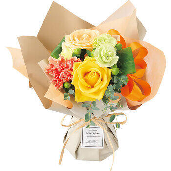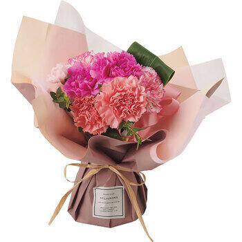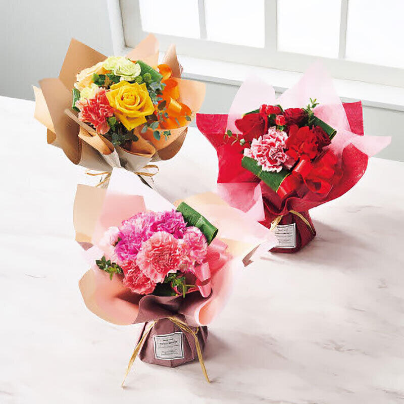 バラやカーネーションを束ねた華やかなスタンディングブーケ。