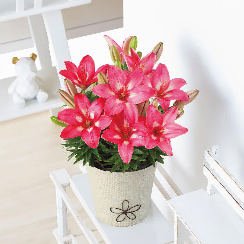 ユリ(5.5号鉢)、バスケット●お手入れのしおり付●つぼみの状態でお届けします。