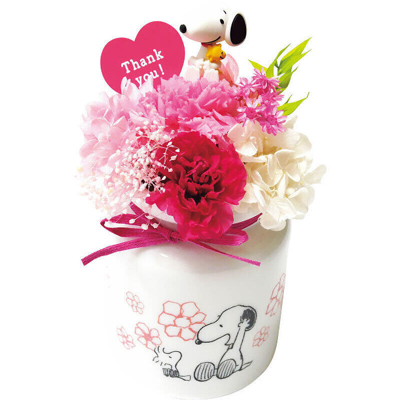 スヌーピーとウッドストックの可愛い絵柄の器にピンク系のお花でまとめた優しい雰囲気のプリザーブドフラワーアレンジメントです。スヌーピーとウッドストックがハグするピックが大切に思う気持ちをお伝えいたします。