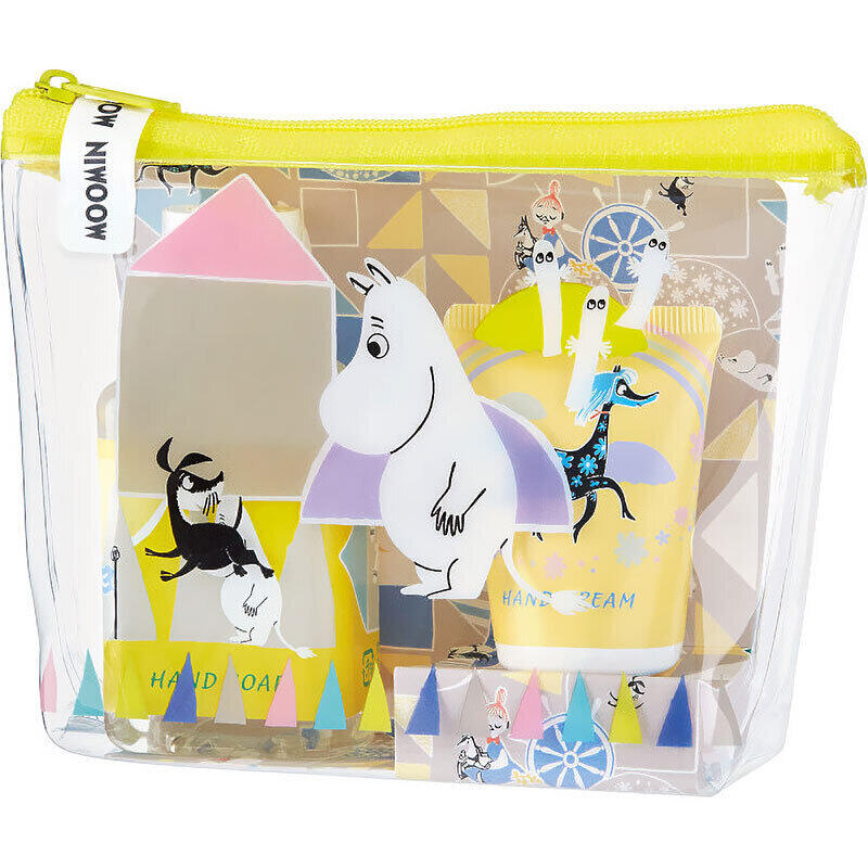 ムーミン谷の仲間たちが描かれたクリアポーチに、ミニサイズのハンドソープとハンドクリームが入ったセット。