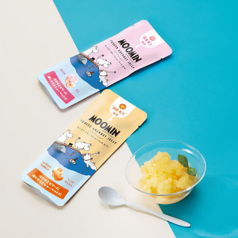 国産果汁を使用した、なつみ・ぽんかんともものシャーベットゼリーを「ムーミン」パッケージでお届け。常温時はゼリーとして、冷凍するとシャーベットとして二通りの食べ方を楽しめます。