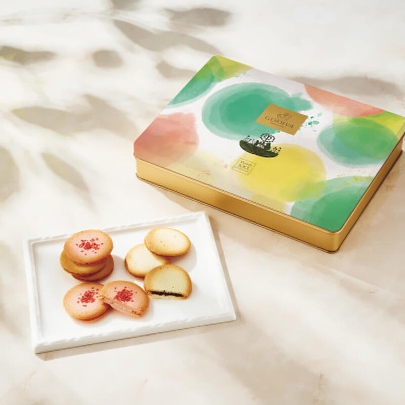 シャディ100周年限定パッケージ。リト@葉っぱ切り絵のアートを入れ込んだスペシャルな商品。サクっと軽やかな2種のラングドシャ生地に、異なる味わいのチョコレートの組み合わせ。ほろ苦いダークチョコレートをサンドしたショコラクッキーと、ストロベリー味のホワイトチョコレートをピンクのラングドシャ生地でサンドしたクッキーを詰め合わせました。
