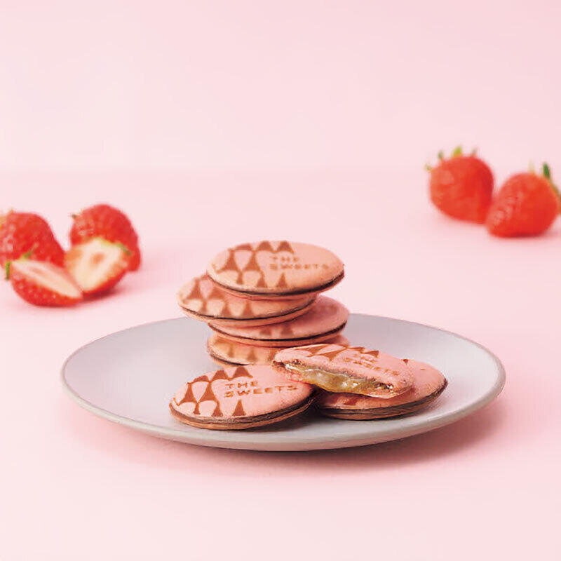 あまおう苺のフリーズドライを混ぜた濃厚なラングドシャ生地で、キャラメルとチョコレートをサンド。