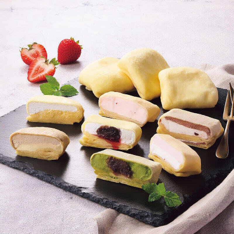生地は和菓子屋ならではの大福のようなもちっとした食感を再現しております。その風味豊かなクレープ生地に、甘さ控えめのホイップクリームを包みました。7種類のクレープとバラエティ感のあるセット。