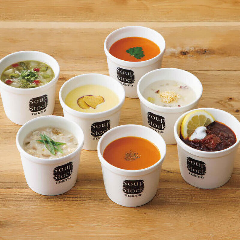 オマール海老のビスク・東京ボルシチ・とうもろこしとさつま芋のスープ・焼き鯛だしの和風スープ・緑の野菜のミネストローネ・イタリア産完熟トマトのクリームポタージュ・塩糀と生姜のチャウダー 各180g×各1
