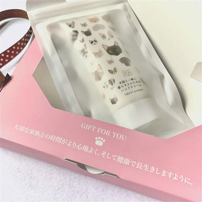 犬猫と一緒に暮らす人のためのハンドクリームギフト。キュートな専用ギフトボックスに入っています。犬猫にも人間にも優しい成分で作られたハンドクリーム。犬猫と一緒に暮らす方へのギフトに喜ばれています。天然由来成分100%、ハンドクリームを塗った手でも気兼ねなく動物と触れ合える最大のポイント。5つのフリー、サラッとベタつかない感触なのに潤い感が持続します。