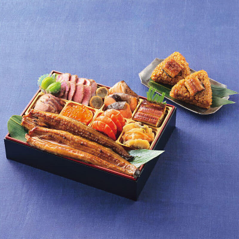 ローストビーフ、太刀魚八幡巻、若桃甘露煮、サーモン西京焼、鰻の柳川しんじょう、合鴨ワインソース仕立て、ローズスモークサーモンいくら添え、海老スモーク風味、すずきの南蛮漬け、九州産うなぎ蒲焼(真空)100g×2【特典:うなぎ御結び×2】●約2人前