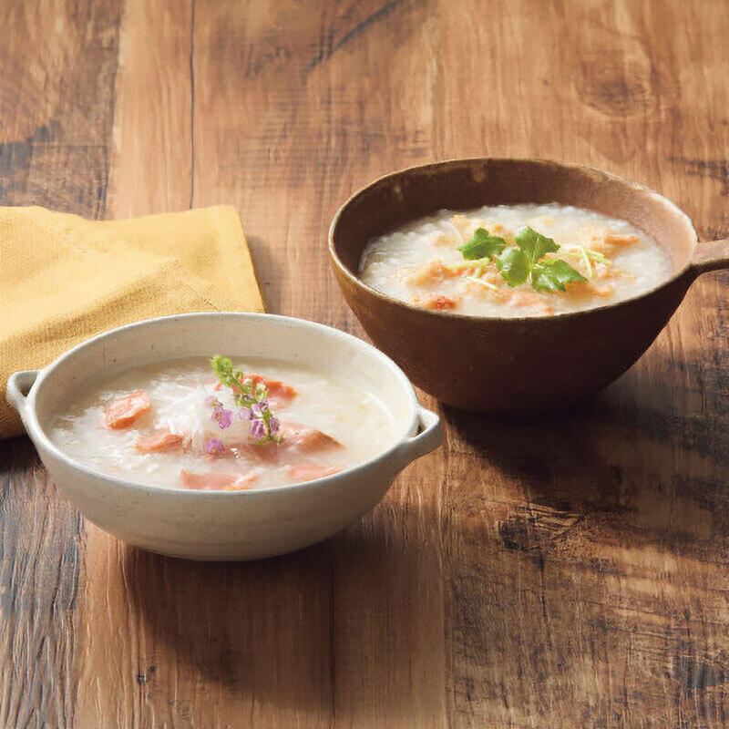 かに雑炊と紅鮭雑炊を各3食ずつ詰め合わせた贅沢なセット。