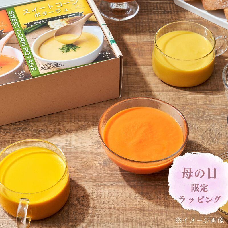 雪にんじんポタージュ150g×1、スイートコーンポタージュ150g×1、かぼちゃポタージュ150g×1、トマトポタージュ150g×1