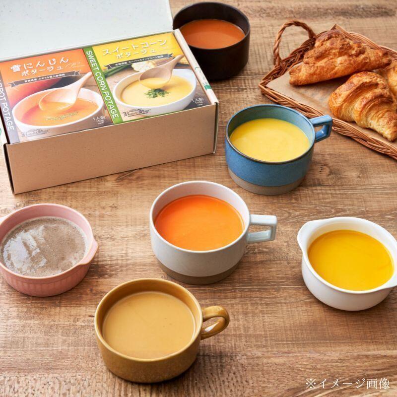 雪にんじんポタージュ150g×2、スイートコーンポタージュ150g×2、マッシュルームポタージュ150g×1、かぼちゃポタージュ150g×1、トマトポタージュ150g×1、安納焼き芋ポタージュ150g×1