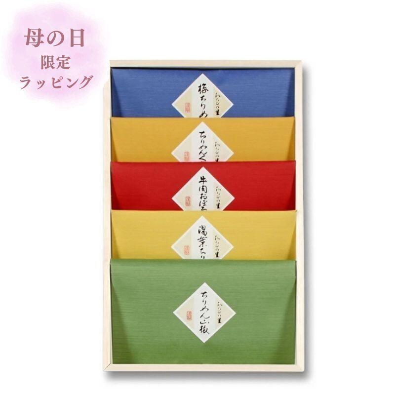 ちりめん山椒、牛肉おぼろ煮、梅ちりめん、湯葉ちりめん、ちりめんくぎ煮を収めた、木箱入りで高級感のあるセットです。