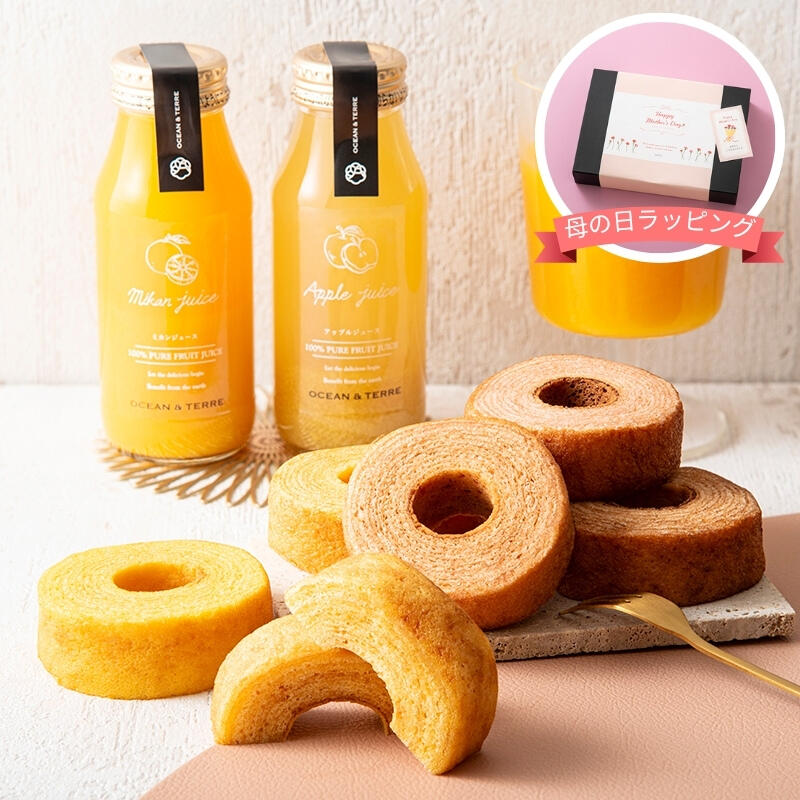 彩りも華やかなジュースとバームクーヘンを、OCEAN&TERREのロゴが型押しされたシンプルなボックスでお届け。洗練されたパッケージのため、相手やシーンを選ばずにお使いいただけます。