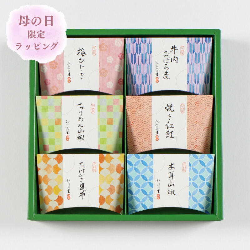 ちりめん山椒や焼き紅鮭など人気の商品6種セットに、母の日限定の掛け紙とメッセージカードを添えてお届けします。