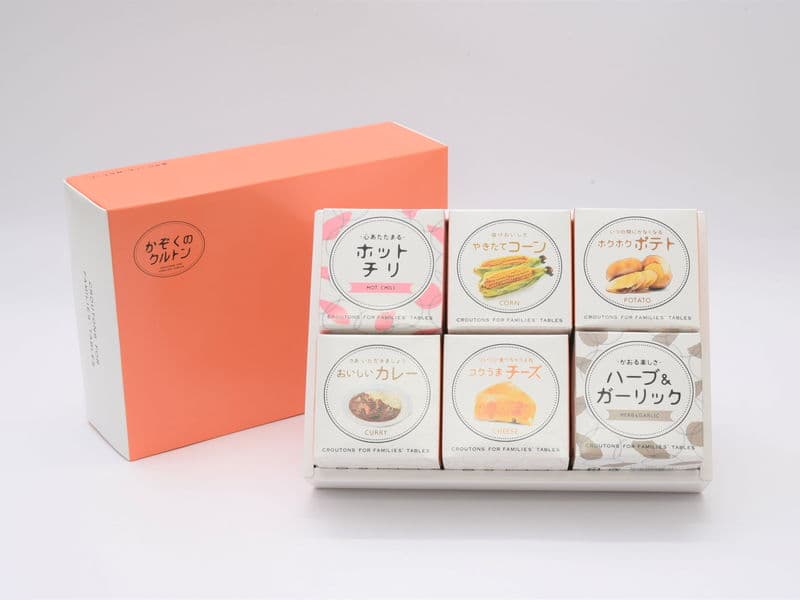 絶品食感のおやつクルトンより「コクうまチーズ」「ホットチリ」「おいしいカレー」「ハーブ&ガーリック」「やきたてコーン」「ホクホクポテト」をセットにしました。