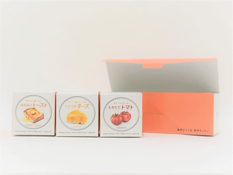 「かぞくのクルトン」本店(名古屋市、本山)人気ベスト3の「もぎたてトマト」「コクうまチーズ」「はちみつトースト」をセットにしました。表面は「サクサク」、中は「ほんのりしっとり」と焼き上げた絶品食感のおやつクルトンは、おいしさと安心安全にこだわり作られています。ちょっとしたお礼やお返し、手土産、ご自宅での食べ比べにおすすめのセットです。