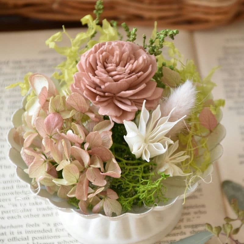 優しい色合いのプリザーブドフラワーを、アンティーク風のブリキ花器にアレンジメントしたギフトです。生花に特殊な加工を施したプリザーブドフラワーは、水やり・お手入れ不要で、長く飾ることができます。