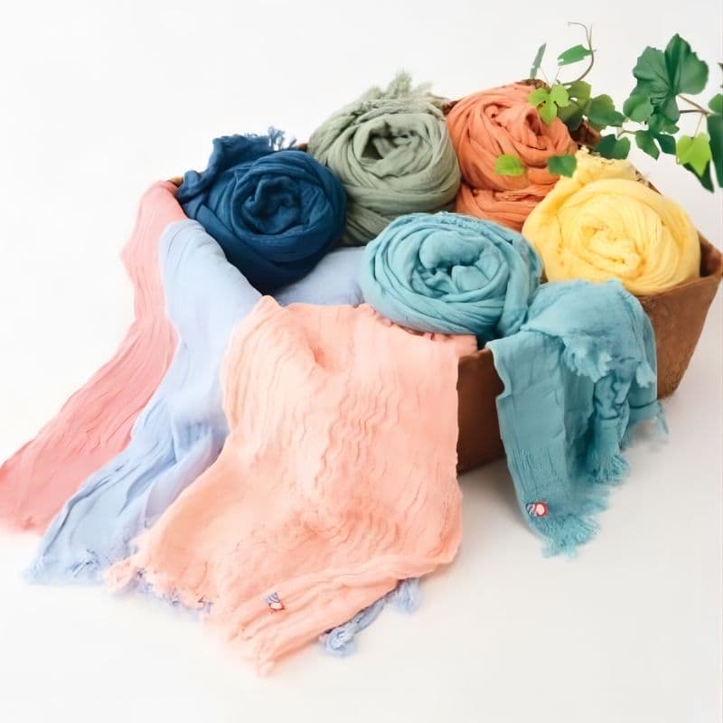 シワ感のある特殊な織りでふっくら柔らかい生地に仕上げています。汗ばむ夏でも肌にまとわりつかず、快適にお使いいただけます。コットン100%で肌馴染みもよく、通気性もあり乾きも早いです。今治タオルブランド認定商品なので、吸水性にも優れ首元の汗もしっかり吸水します。ご自宅でネットに入れて洗濯できるので、いつも清潔にお使いいただけます。紫外線対策や、シンプルになりがちな夏のコーデのアクセントとして使えるファッション性も魅力です。