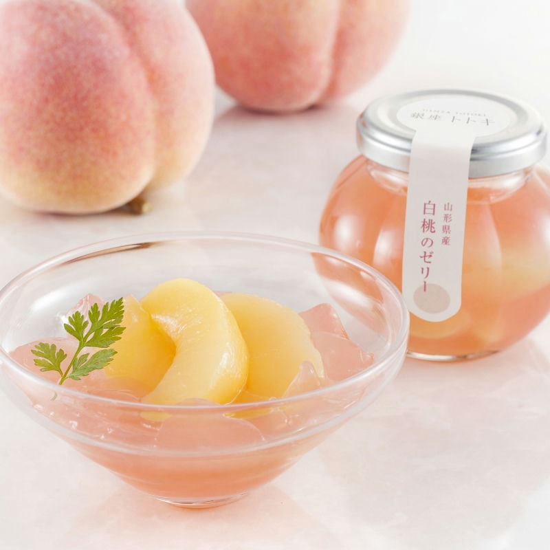 山形県産白桃の果肉と白桃ピューレをふんだんに使い、桃の形を模した愛らしい瓶に閉じ込めた夏のスイーツギフト。