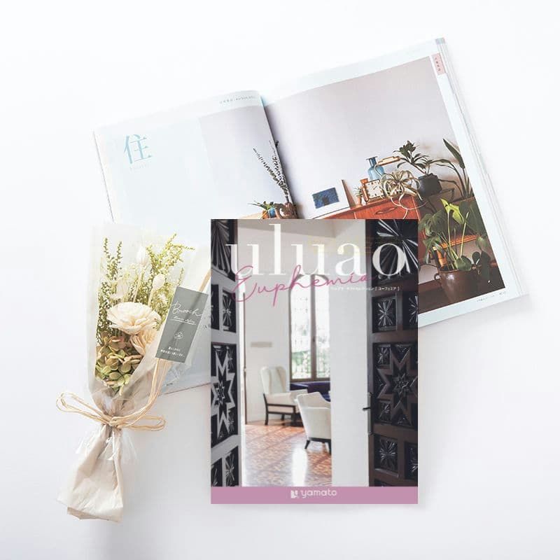 お祝いムードを高める、「カタログ×ブーケ」のおしゃれなギフト。シックな表紙が印象的な『uluao(ウルアオ)』と、やさしい色合いのミニブーケのセットは、おめでたいシーンにぴったりの特別感を演出します。結婚や出産などの慶事はもちろん、門出を祝う贈り物にもぜひどうぞ。