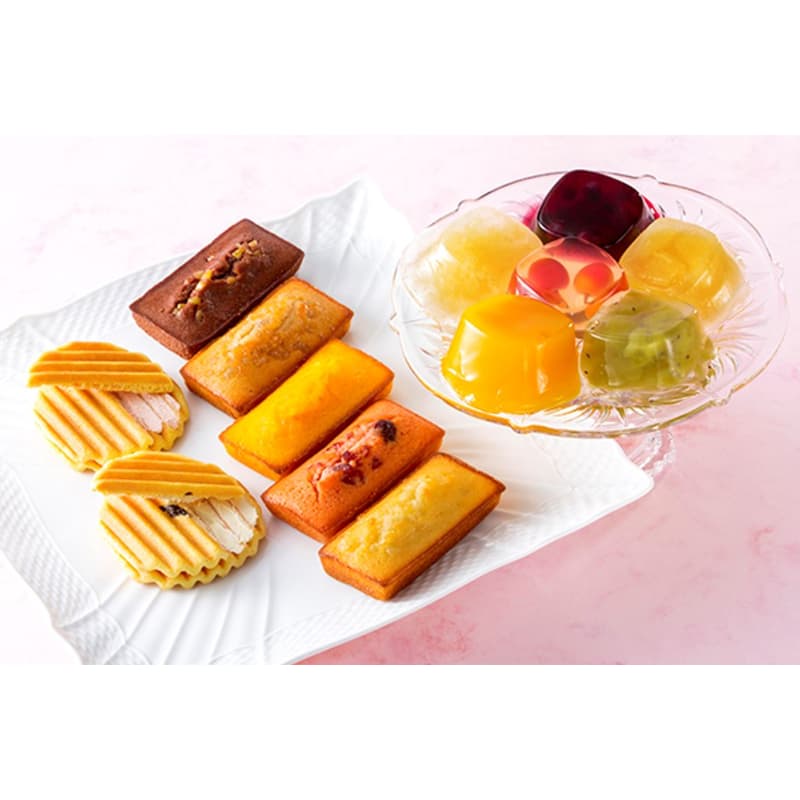 フルーティーなゼリーと、果汁入りの生地にひと粒ひと粒丁寧に果肉をトッピングしたオリジナルフィナンシェ、さっくりとした食感のクッキーにクリームをサンドしたヴァッフェル。バラエティに富んだ詰め合わせです。