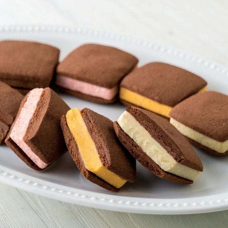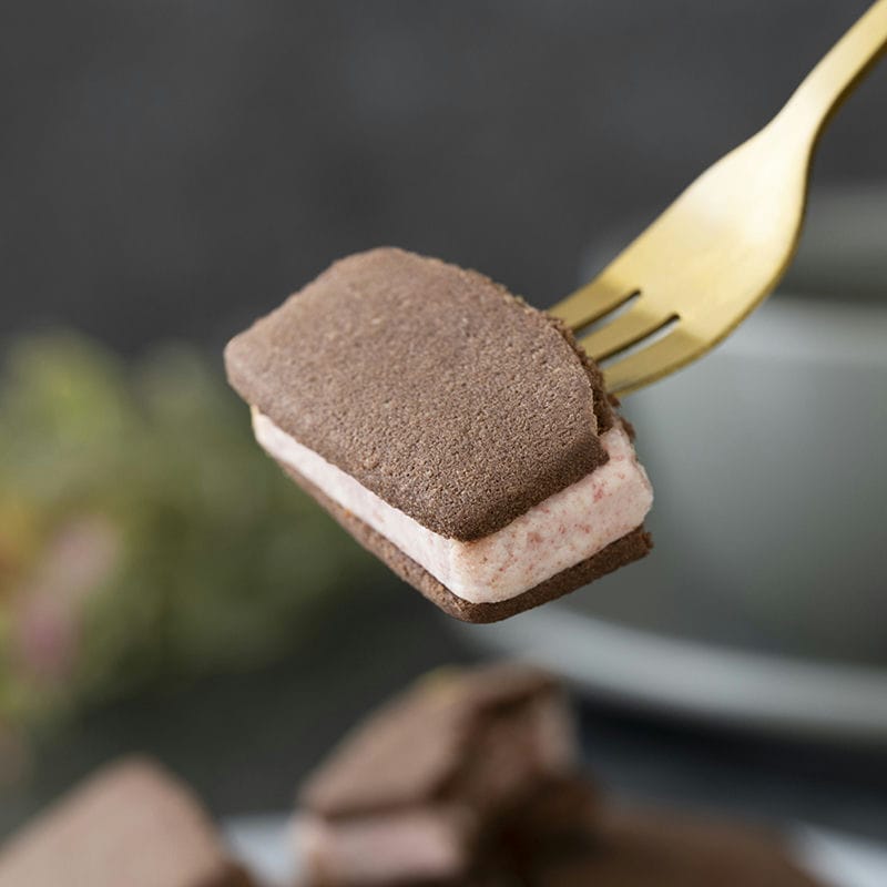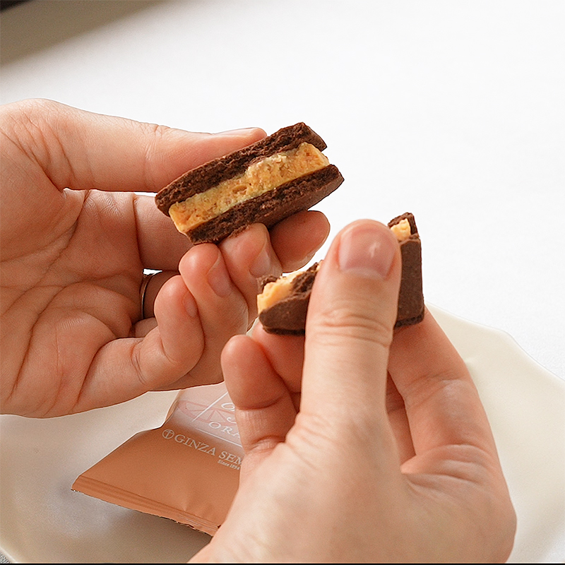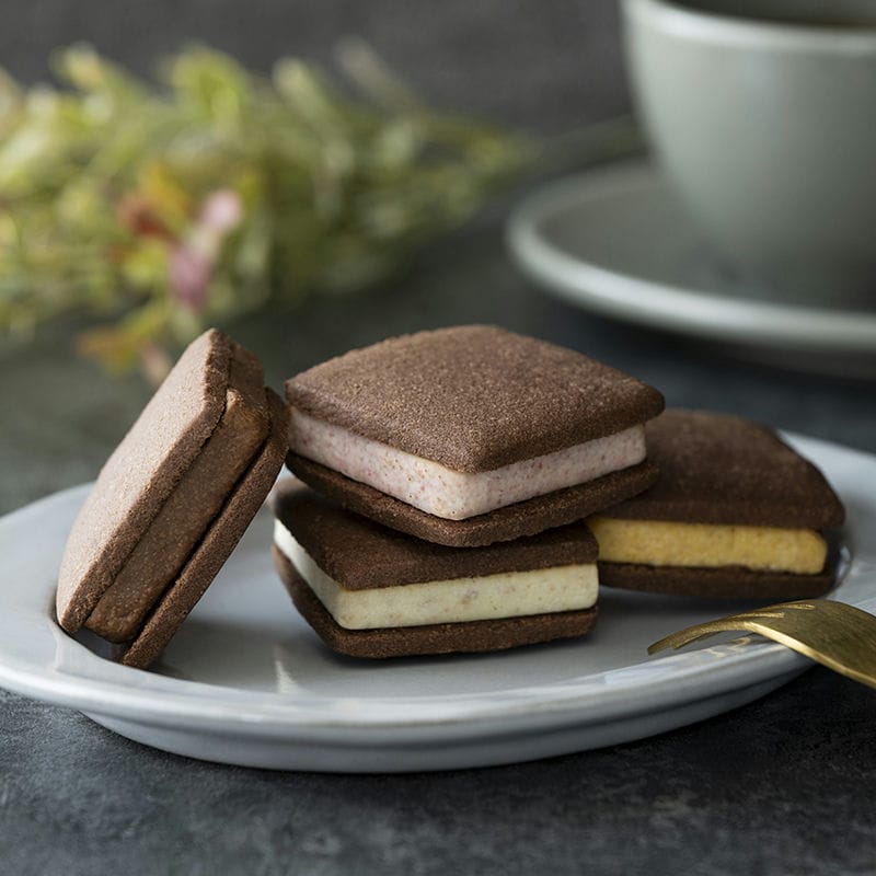 サクッとしたショコラサブレに、ストロベリー、オレンジ、バナナ、キャラメル、4種のフルーツショコラをサンドしました。