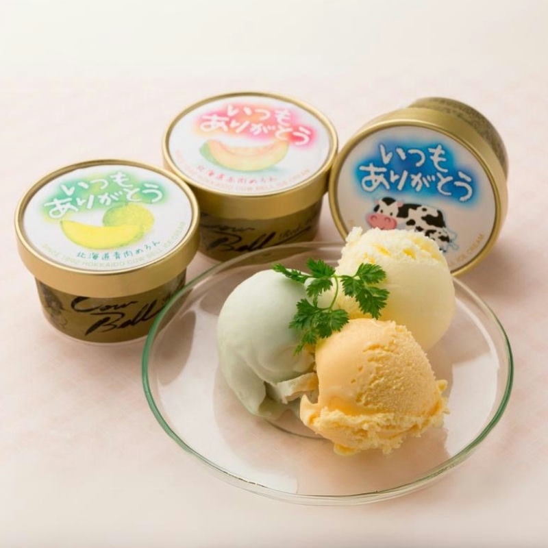 北海道産赤肉、青肉メロンと、北海道産の生乳を使用したバニラの3種類のアイスセットです。感謝の気持ちを込めて「いつもありがとう」のメッセージを入れたカップでお届けします。様々な贈り物に最適です。