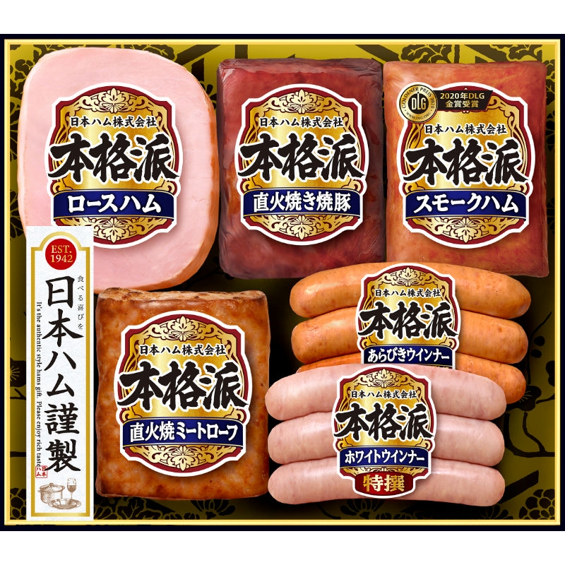 商品内容:ロースハム170g、直火焼き焼豚・スモークハム各160g、直火焼ミートローフ135g、特撰ホワイトウインナー・特撰あらびきウインナー各70g