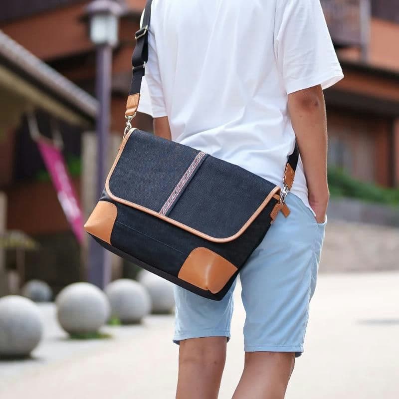 「craftsmanship(クラフトマンシップ)」のショルダーバッグ。井原産デニムを贅沢に使い、「旅人」をテーマにメッセンジャーバッグ型に仕立てました。革部分には姫路産の上質な本ヌメ革を採用し、上品さをアピール。内装は赤色生地で調和させ、A4ファイルやタブレット・PCルームが装備されています。しっかりとした作りなのでビジネスショルダーとして、また日常使いにも愛用できる逸品です。
