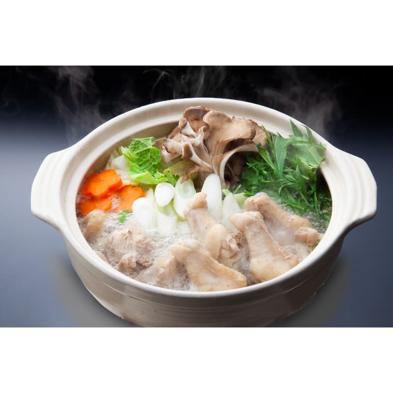 主に植物原料の飼料で育てた九州産「ありたどり」。鶏ガラを8時間以上煮込んだ白濁スープにもも肉、手羽元とぽん酢をセットいたしました。まずは器に塩をひとつまみ入れて沸騰したスープを入れて深い味わいをお楽しみください。