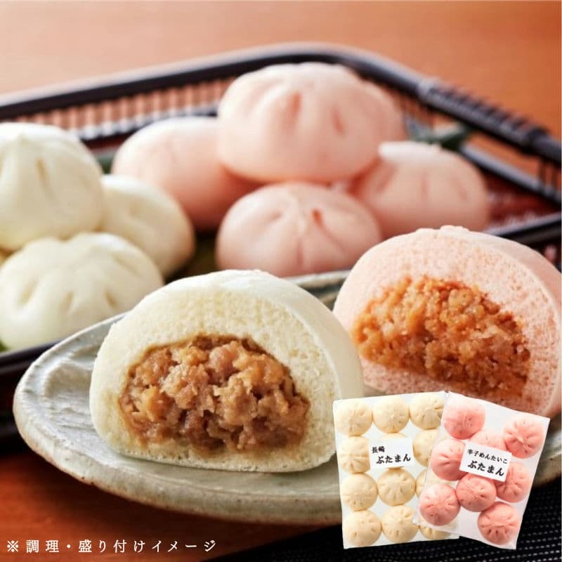 豚肉と玉ねぎなどを使い、ふっくらとした皮に包み込んだぶたまんと、辛子めんたいこのつぶつぶを加えた辛子めんたいこぶたまんのセットです。電子レンジで温めてお手軽にお召し上がりいただけます。
