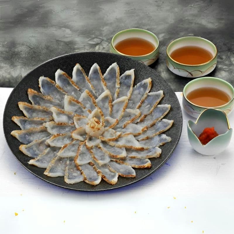 山口県の日本海側萩市沖でフグ延縄漁で水揚げされた活天然マフグは鮮度抜群です。そのフグを活きたまま処理し、身の表面を強火でサッと炙り、旨味と新鮮さを閉じ込め熟練の職人が丁寧に刺身に仕上げました。刺身を引いてすぐに-196℃液体窒素で瞬間凍結するので、いつでも冷蔵庫で解凍すれば引き立ての美味しさが味わえます。外側は香ばしく、内側は透明感があり、プリプリの生の食感を特製ポン酢・モミジオロシでどうぞ。